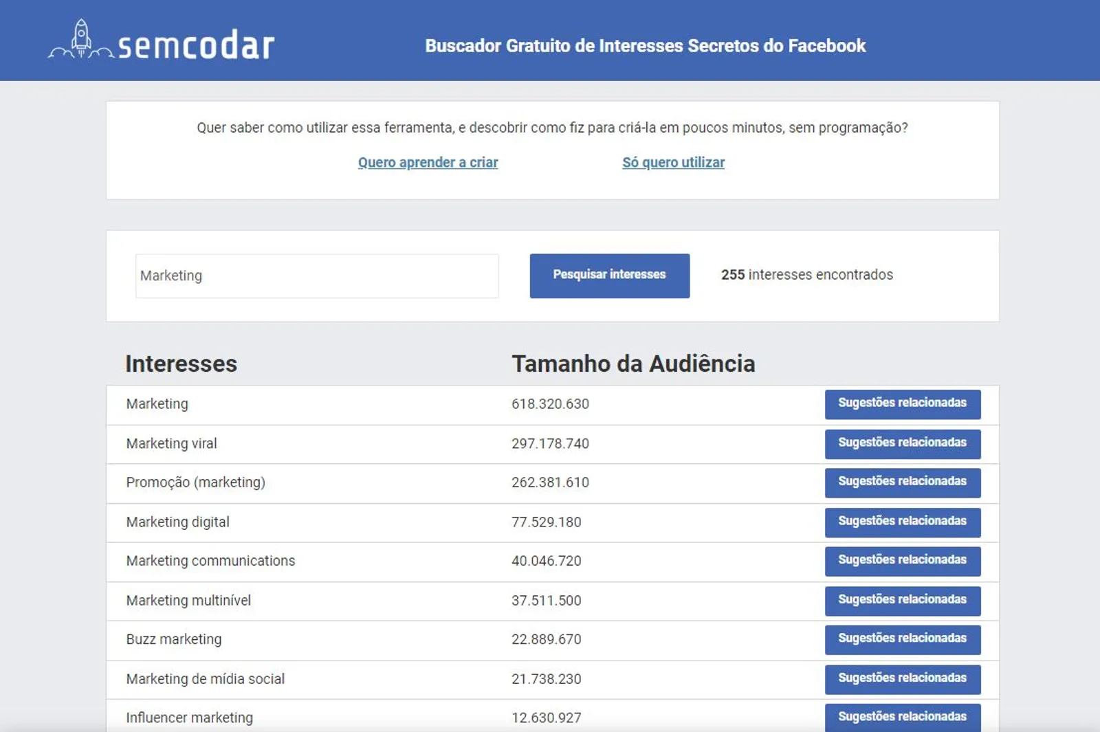 - Se alguma palavra-chave não funcionar (retornar 0 interesses), tente novamente sem acento ou sem espaço. A API do Facebook é um pouco chatinha em relação a essas variações.